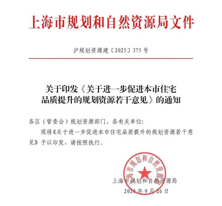 9月26日,上海规划与自然资源局发布关于印发《关于进一步促进本市住宅品质提升的规划资源若干意见》的通知。