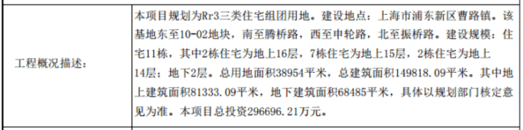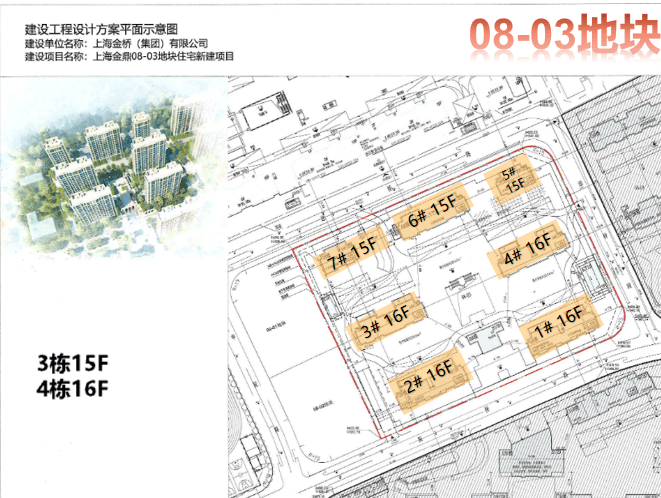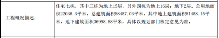 08-03地块住宅新建项目住宅7栋,其中3栋为地上15层,4栋为地上16层。规划用地面积为22036.3平方米,总建筑面积为88457.03平方米,地上建筑面积为51458.15平方米,地下建筑面积为36998.88平方米。
