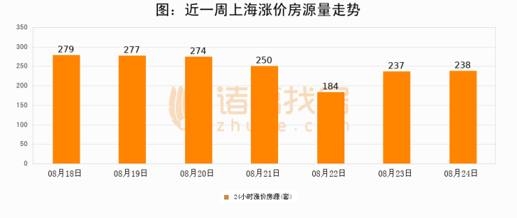 根据诸葛找房数据显示,上海24小时涨价房源量为238套,较08月23日增加1套,环比上涨0.4%。与此同时,涨价房源占比小幅扩大,业主信心有所提升。