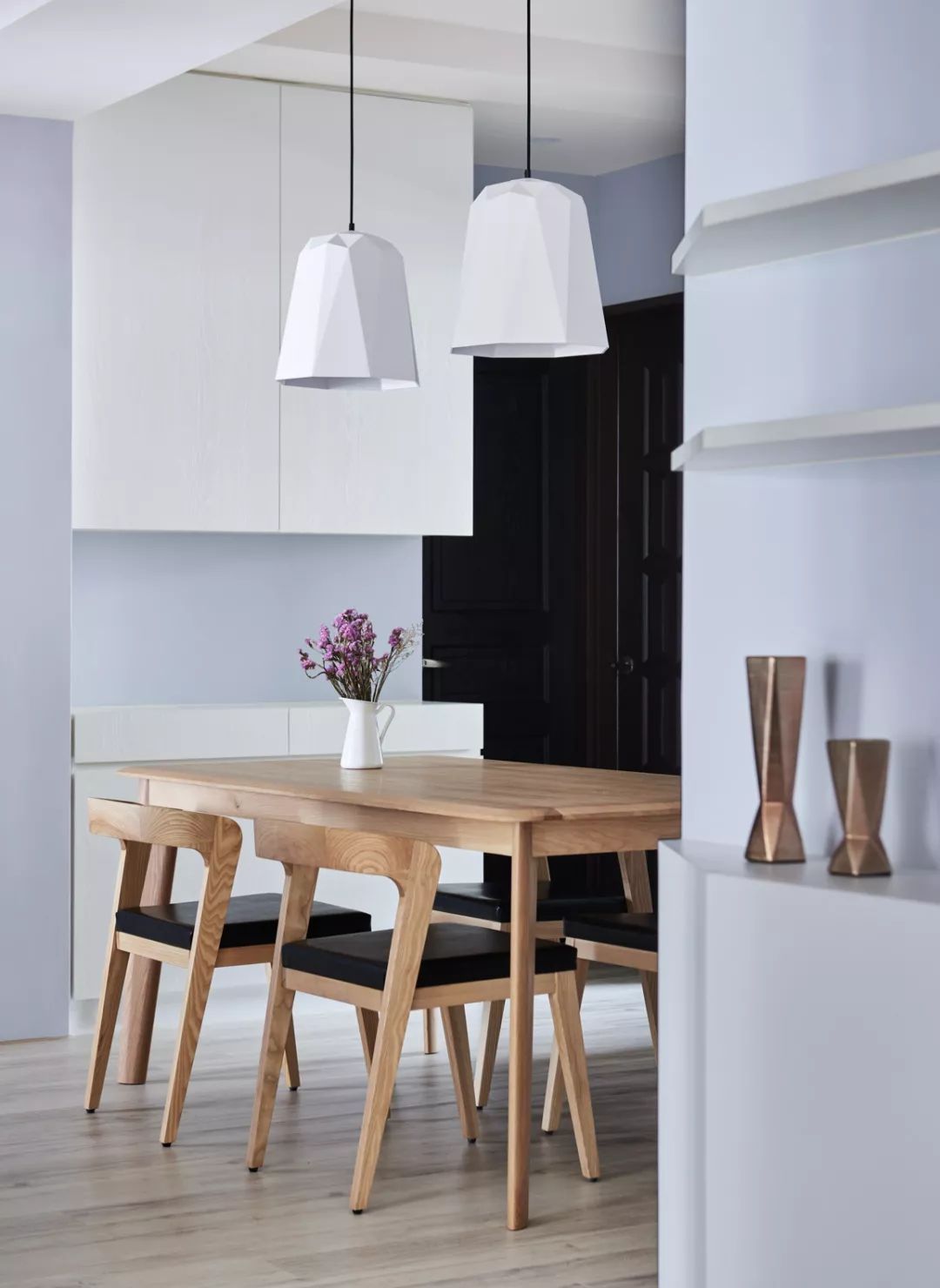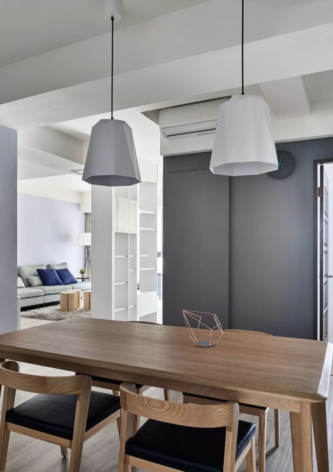 ▲原木餐椅,搭配时尚的一灰一白的吊灯,丰富的层次感,散发着优雅的气质,同时也增添了一些艺术的质感。