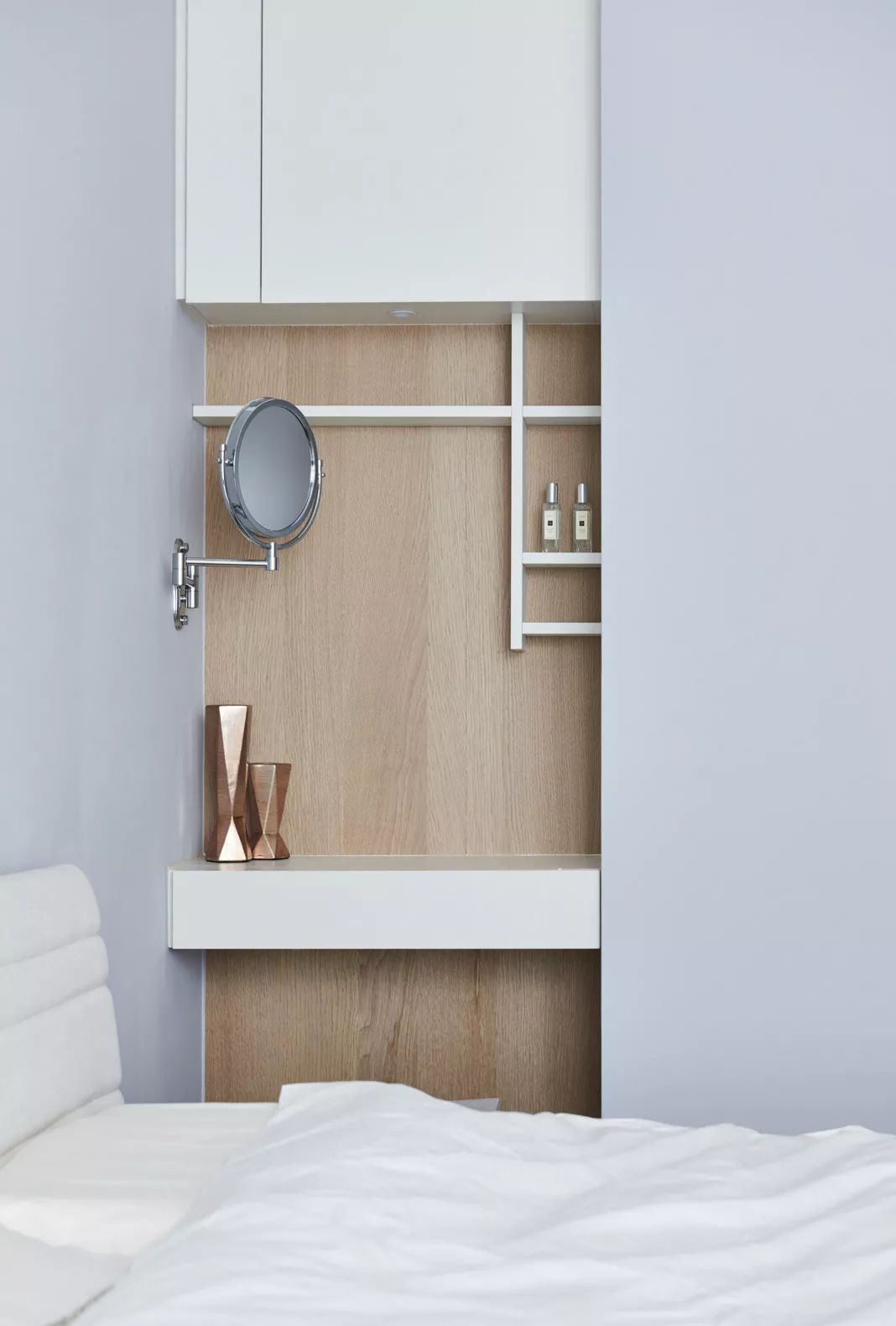 ▲在床的一侧,设计师利用墙体为主人打造了一个小小的梳妆台,可移动的镜子,方便收纳,也方便使用。