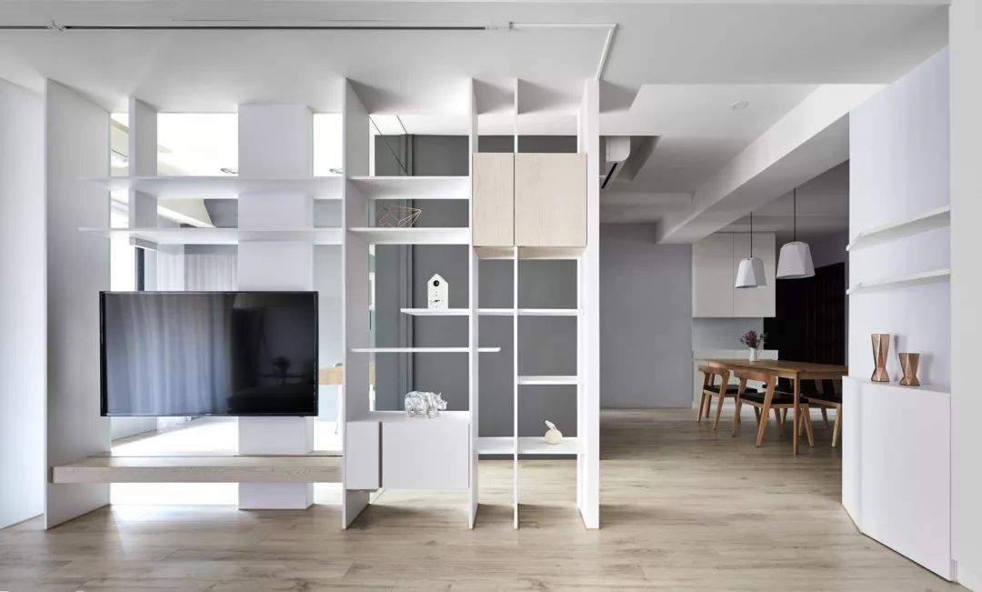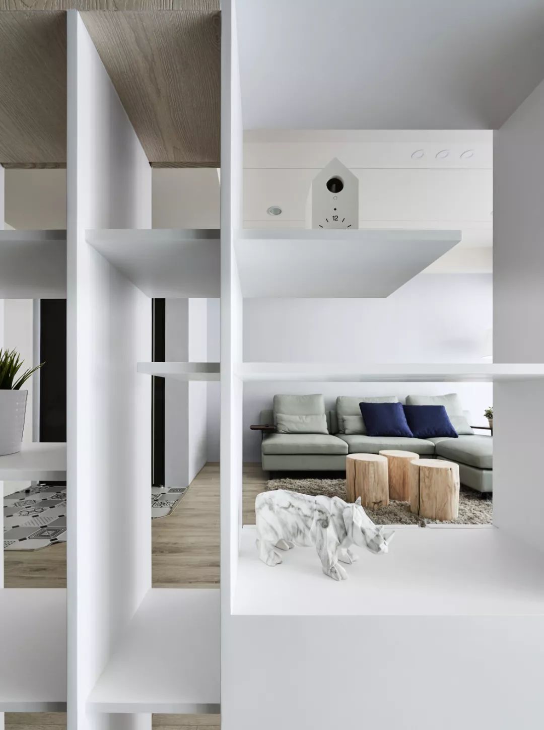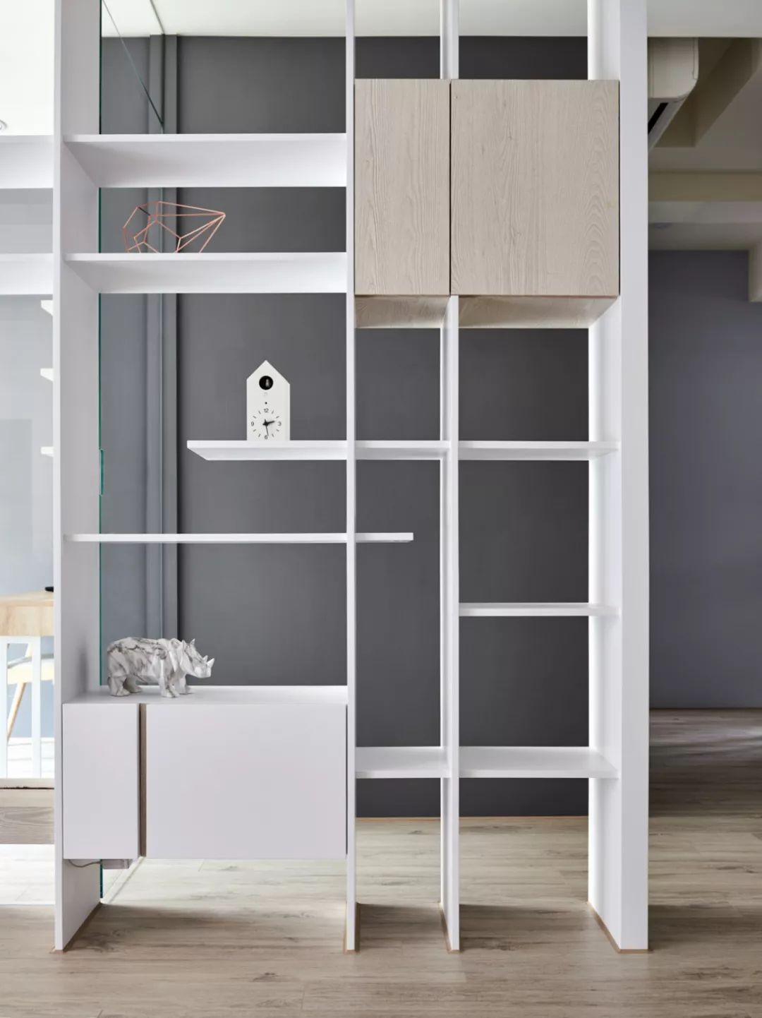 ▲大小不一的隔断空格,方便主人摆放各式各样的物品,简单也不遮挡视线。