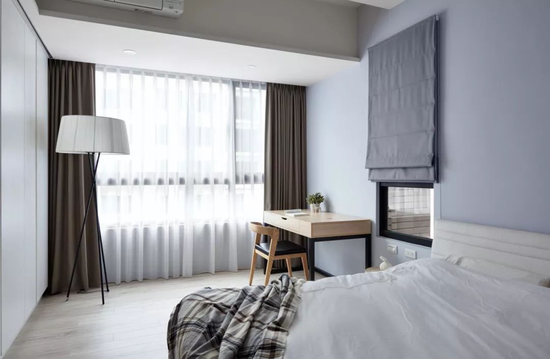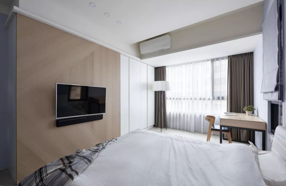 ▲床位的木饰板+壁挂电视机,侧边靠窗的衣柜与背景墙连贯一体,以白色作为柜门。在玻璃窗户,加之纱质窗帘能够保证卧室有足够的采光的同时也有效阻隔了灰尘,呈现出一个轻松优雅的休息空间。