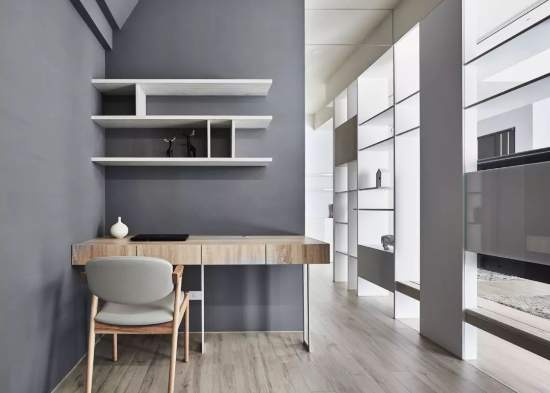 ▲设计师在原本属于客厅的空间里用镂空的置物柜为主人隔出一块小小的工作区,相对独立的空间方便主人在工作时更快进入状态且不易被打扰,背后的玻璃墙也解决了采光问题。