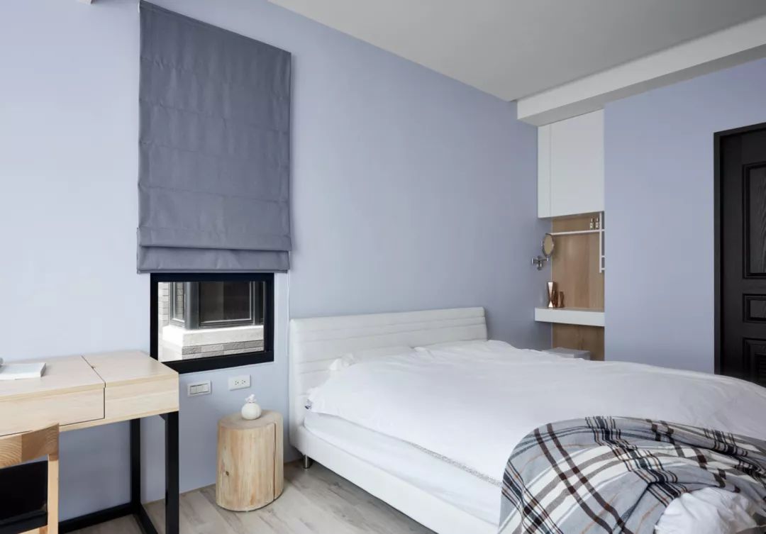 ▲直接用木桩来做床头柜,简单自然,温馨舒适,墙上的幕布在夜晚睡觉的时候拉下来,挡住这个小窗户,也给淡紫色墙面作了修饰。