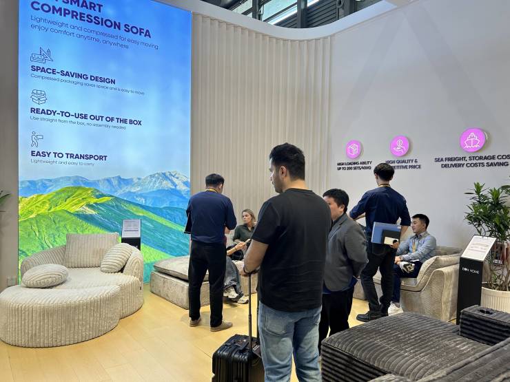 除了环保床垫,展位上的多款家居“新宠”压缩沙发同样备受关注。凭借新颖设计与实用属性,这些压缩沙发深受海外客户青睐,成为展位上的另一大吸睛亮点,也展现出宜奥在产品创新上的实力。