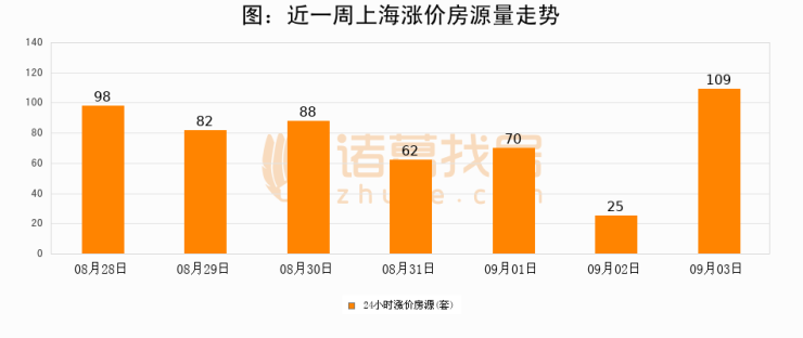 根据诸葛找房数据显示,上海24小时涨价房源量为109套,较09月02日增加84套,环比上涨336%。与此同时,涨价房源占比小幅扩大,业主信心有所提升。