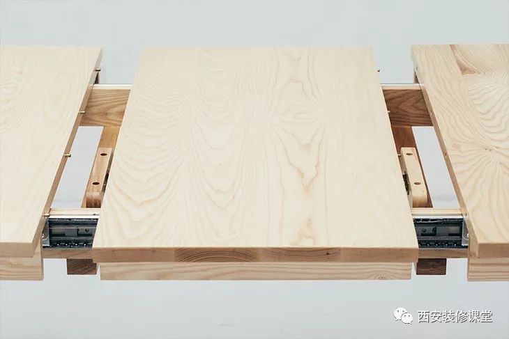 收起时为长度 1.2 米的六人餐桌,拉开后则变身为一张 1.6 米的八人大餐桌。