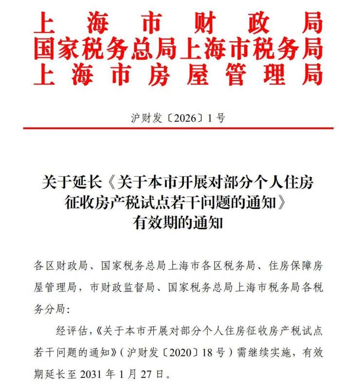 最新消息!上海市财政局、上海市税务局、上海市房屋管理局联合发布通知,上海房产税将继续执行,有效期延长至2031年1月27日!