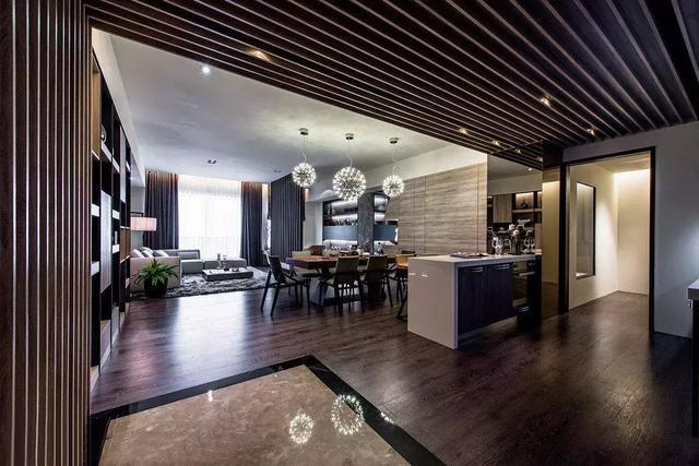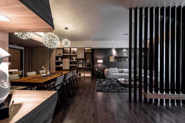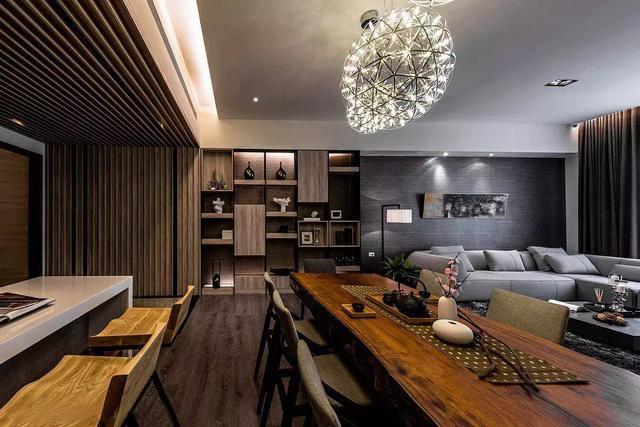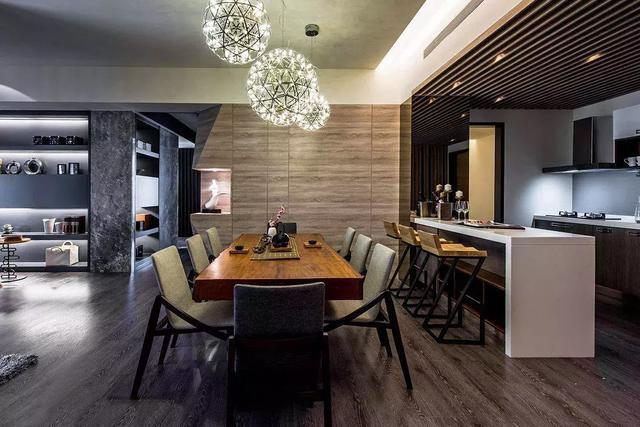 厨房、餐厅、客厅依次分布。我们先来看看餐厅,设计者以木质包覆立面,并与转角柜的立体造型延续,成为原木餐桌的衬底。