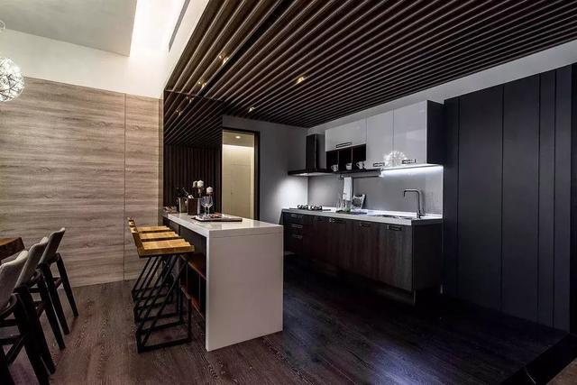 格栅线条由玄关的收纳柜面造型延伸天际,简练线条创造具向量感的视觉延伸。小小的厨房也是时尚感十足。
