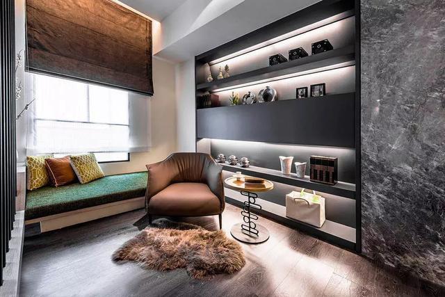 客厅太大的话,就会破话整个的家居氛围,所以才划出来一定的区域充当书房,精品展示造型的开放书架,以灰阶与石材表现内敛大器的质地,窗前的卧榻则增添空间的慵懒感受。