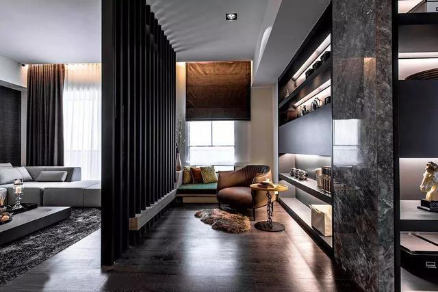 客厅也是一分为二,一边是会客厅,一边是休闲书房,中间用连续的薄铁件以纵向的百叶造型,以虚实错落的造型规划电视墙,同时为书房与客厅隔间。