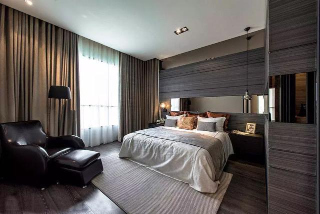 卧室中带状的茶镜与木质纹理,以深、广两个方向延伸空间错落的景深层次,带出温润与时尚的张力。