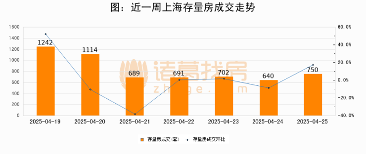 从存量房来看,2025年04月25日上海存量房单日成交750套,比昨日增加110套,环比上涨17.2%。从近一周存量房成交来看,上海存量房日均成交套数为832套,04月25日单日成交750套,低于近一周平均水平9.9%。