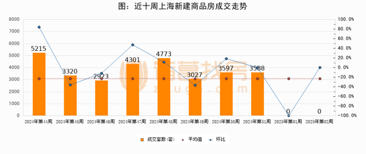 进入2025年第02周(01月06日-01月12日),上海新建商品房成交0套,较上周持平