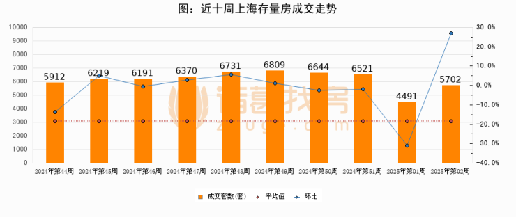 存量房方面,第02周上海存量房成交5702套,较上周增加1211套,环比上涨27%。从近十周成交走势来看,周均成交套数为6159套,本周低于平均水平7.4%。