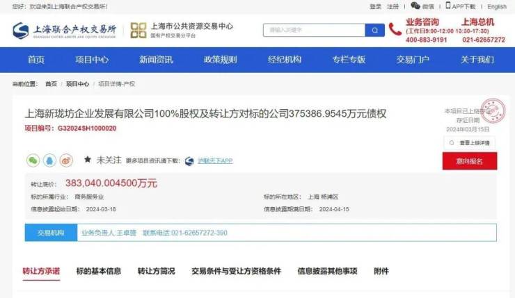 3月15日,上海联合产权交易所官网发布信息,上海新珑坊企业发展有限公司100%股权及转让方对标的公司375386.9545万元债权正式挂牌转让,其中转让方为上海杨浦城市更新建设发展有限公司。