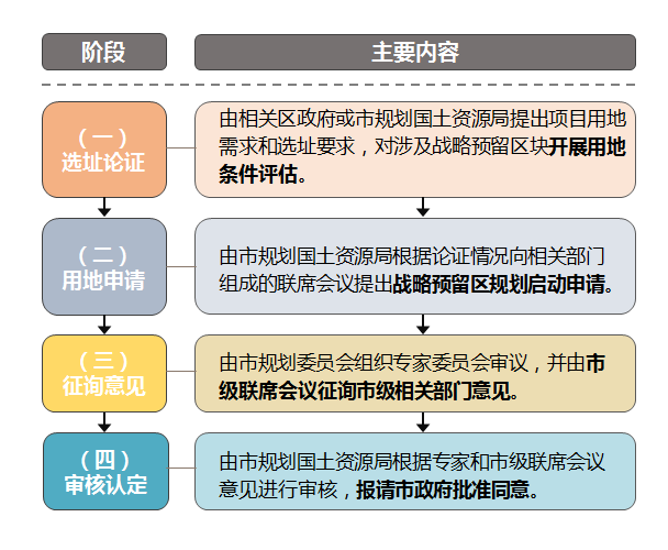 1、经市规划委员会审议,对符合城市总体规划的功能导向和布局要求的,由市级相关部门会同相关区政府依法合规对战略预留区启动规划编制、审批和实施管理。