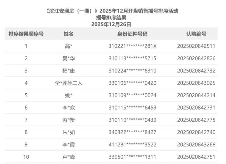 其中,身份证310开头的上海本地购房者最多,达176组,占比约53.8%;江苏省33组、浙江省25组、安徽省22组,三省合计约占总数四分之一。此外,河南省有17组,湖北、福建各7组,其余省份也有零星分布。名单中还出现一位港澳身份认购者。