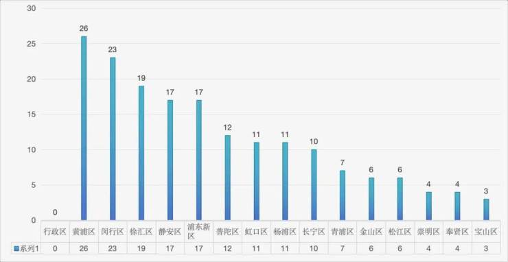 再看上海本市,中心城区较多,最多的是黄浦区26组;其次是闵行区23组;徐汇区19组,静安区和浦东新区17组;普陀区12组,虹口区、杨浦区11组;长宁区10组;其余几个区除嘉定区外也有少量分布。
