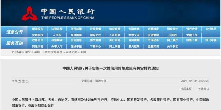 12月22日,央行发布《中国人民银行关于实施一次性信用修复政策有关安排的通知》。