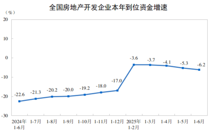 另一方面,1—6月份,新建商品房销售额为44241亿元,下降5.5%,其中住宅销售额下降5.2%,房地产开发企业到位资金50202亿元,同比下降6.2%;