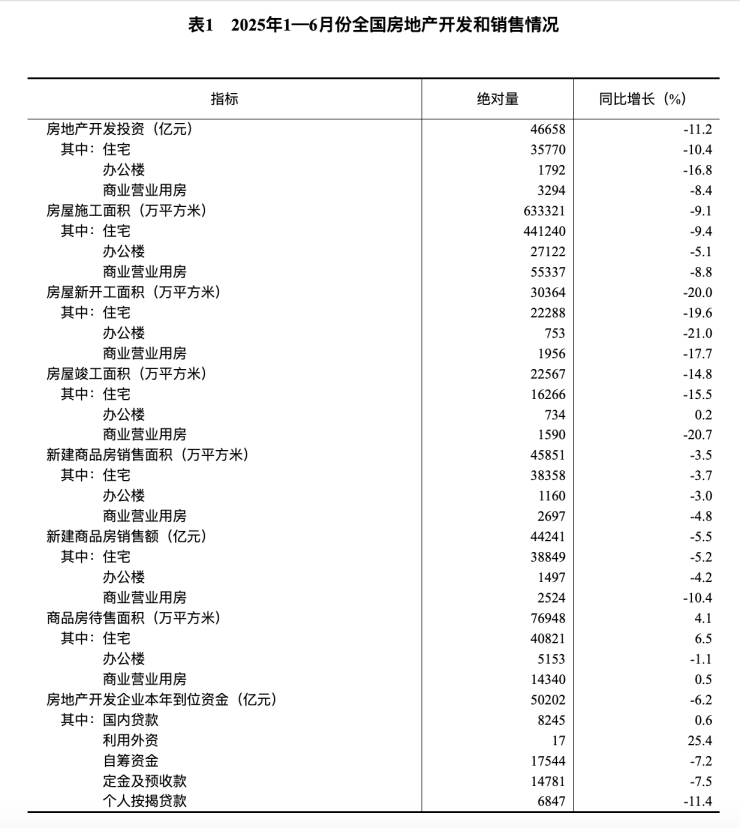 7月15日,国家统计局公布2025年上半年全国房地产市场基本情况。数据显示,1—6月份,全国房地产开发投资46658亿元,同比下降11.2%;其中,住宅投资35770亿元,下降10.4%。