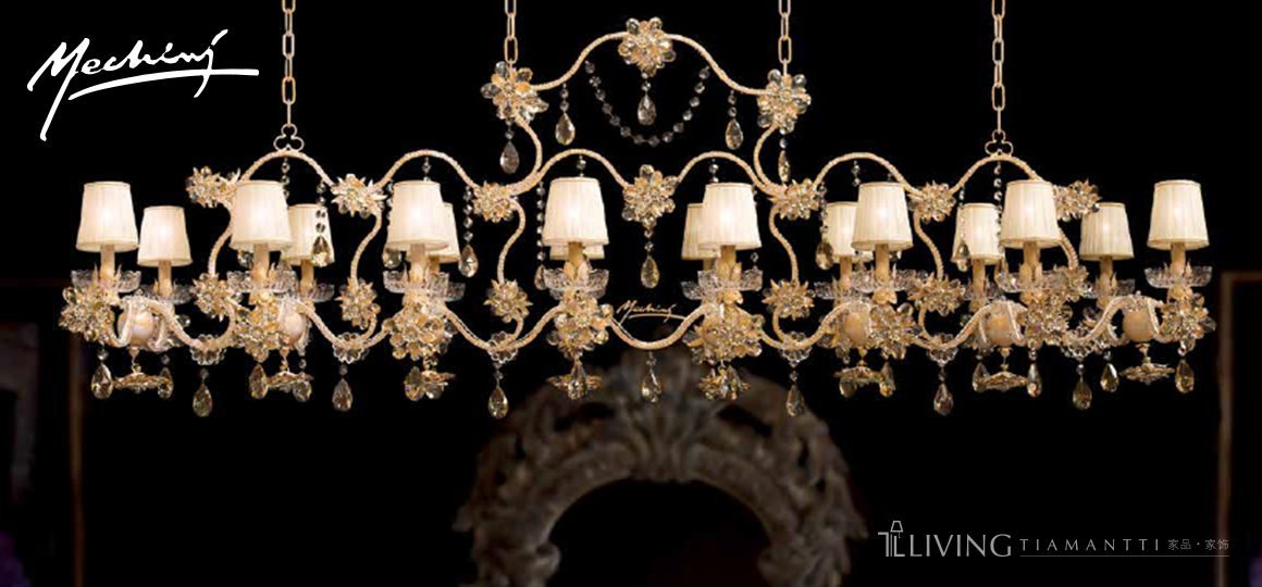 全手工制造的先进灯饰工艺品牌——Mechini,源自艺术之都——佛罗伦萨,已有40多年的工艺历史。每盏灯在制作工序上都由不同的工匠纯手工制作,所以每一盏灯都是独特且少有的。Mechini灯饰使用了水晶和铁艺工艺技术,通过传承手工艺的精雕细琢,吸收了金属的柔美,水晶的剔透,提炼了几个世纪对美的不同见解。