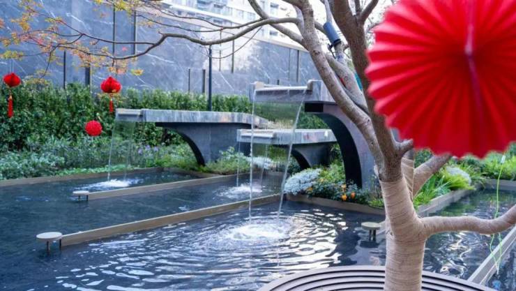 走进社区内部,中央水景区域令人眼前一亮。清澈的水面倒映着天光云影,与精心布局的绿化相互映衬,在动静交融间赋予空间灵动的呼吸感,成为社区无可替代的视觉中心。