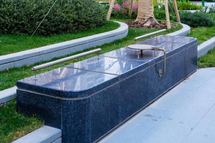 硬质铺装选用肌理自然的石材,与草坪、花境巧妙衔接,营造出柔和过渡的空间层次。在部分景观节点,不仅增设了休闲座椅与夜间照明,座椅材质也经业主要求升级为石材,整体兼顾视觉美感与日常实用功能。