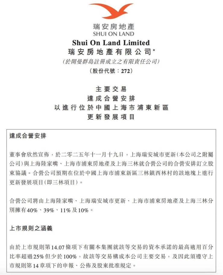 11月19日晚间,瑞安房地产发布公告,正式参与上海浦东三林老镇的合作开发。