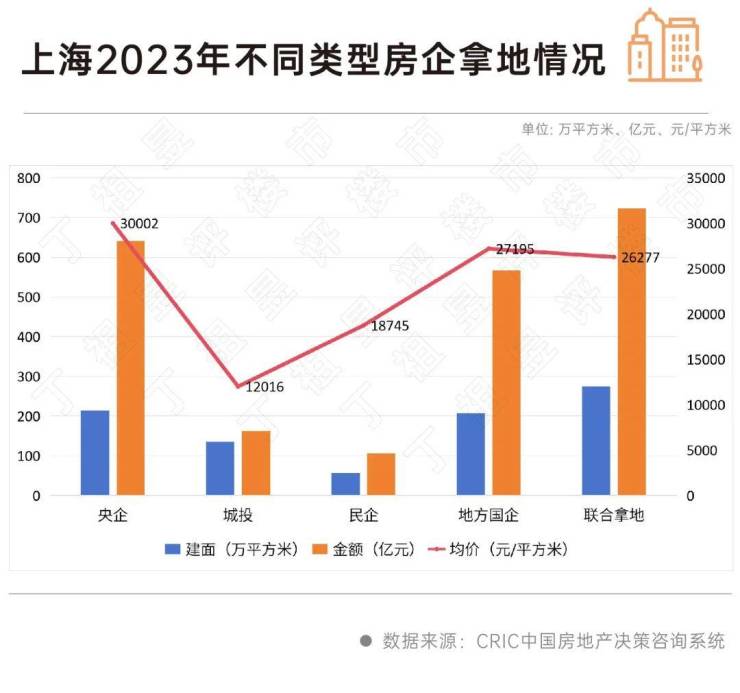 实际上,2023年上海土地市场仍然呈现出了冷热分化的特征,且今年央企、国企在上海土拍中占据了绝对主力地位,拿地金额合计占全年拍地总金额的55%。