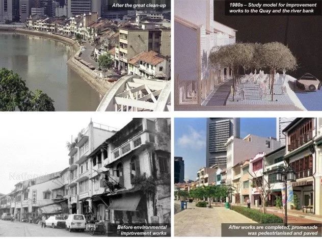 新加坡河滨水区的早期发展主要是在基础设施上的投入。河道清理完毕后,驳船码头上的一些老旧房屋都被拆除,规划成步行友好的人行道,同时建造跨河隧道或步行桥确保两岸的连接性,也希望行人能更多地接触河流。