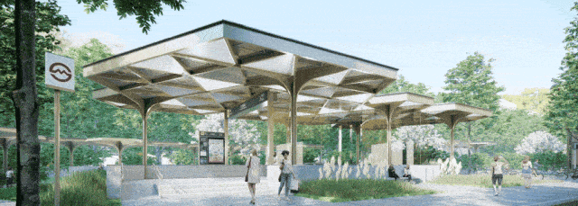 华宁路站位于闵行区华宁路东川路交叉口以西,以折纸作为方案屋顶的设计灵感,通过模数化单元组合,创造出高低起伏的视觉体验。单元间屋檐的落差也丰富建筑的光影效果,为市民提供一个惬意舒适的城市空间。