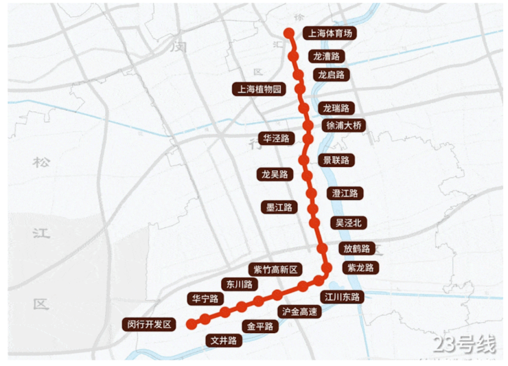 轨道交通23号线(在建中)一期工程沿黄浦江左岸走行,串联徐汇滨江、吴泾转型区、紫竹高新区、华东师大和上海交大、闵行开发区等重要功能板块,是带动徐汇和闵行滨江地区转型发展的重要引擎。全程约28.6公里,设22座地下车站、2座主变电站、1座车辆基地。