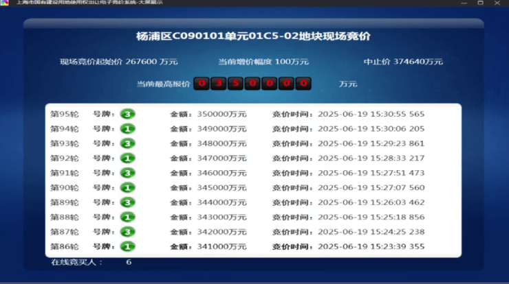 6月19日,保利发展经过95轮竞价摘得杨浦东外滩地块,成交总价350000万元,楼板价95530元/㎡,溢价率30.79%。