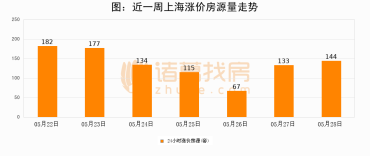 根据诸葛找房数据显示,上海24小时涨价房源量为144套,较05月27日增加11套,环比上涨8.3%。与此同时,涨价房源占比小幅扩大,业主信心有所提升。