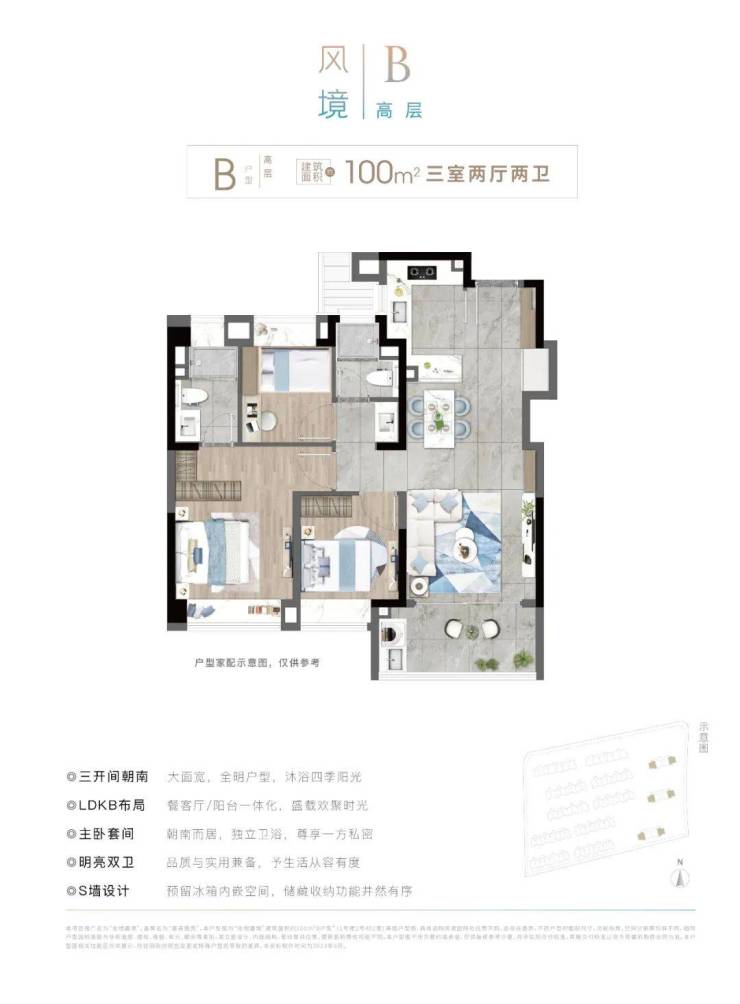 当然,如果预算稍微有点吃紧,平均低于洋房20万的建面约100㎡3房2卫的高层户型也呈现了非常高的居住舒适度!