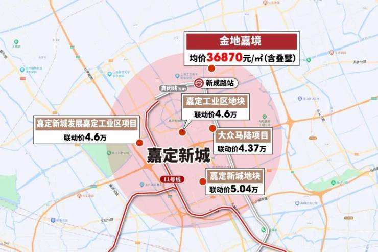 我们来看目前嘉定新城近期土拍的联动价,远香湖附近即使没有地铁的新房价格也在5万+,工业区地块在4.6万/㎡左右,比金地嘉境近一站的大众项目联动价也有约4.4万/㎡! 相比之下,金地嘉境是目前单价3字头,总价300万级入主嘉定新城仅有的机会!