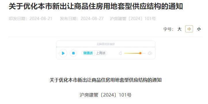 8月27日,上海市人民政府发布关于优化本市新出让商品住房用地套型供应结构的通知。