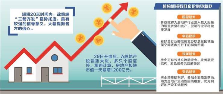 有业内人士认为,“第三支箭”快速发射,或将为房地产行业注入较大规模的增量资金和资产,促进行业平稳健康发展。在短短20天时间内,政策端“三箭齐发”强势托底,具有较强的信号意义,大幅提振各方的信心。看好全行业的信用复苏以及在因城施策空间逐步打开下的销售回暖。