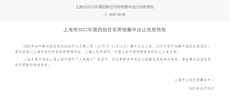 2022年本市第四批住宅用地拟于11月第二周(11月7日-11月11日)集中出让公告,12月中旬开始集中组织交易活动。具体安排以上海市规划和自然资源局网站、上海土地市场网、中国土地市场网等发布的出让公告为准。