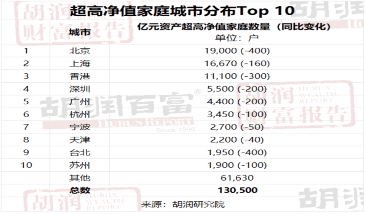 北京继续保持着最多亿元资产超高净值家庭的地区,尽管数量比上年减少了400户,降至19,000户,跌幅为2%,其中拥有亿元可投资资产的家庭有11,170户。广东以17,100户位居第二,比上年减少了260户,跌幅为1.5%,拥有亿元可投资资产的家庭有10,350户。上海位列第三,超高净值家庭数量为16,670户,比上年减少了160户,跌幅为1%,拥有亿元可投资资产的家庭有10,130户。浙江排名第四,超高净值家庭数量为13,600户,比上年减少了200户,跌幅为1.5%,拥有亿元可投资资产的家庭有8,250户。香港以11,100户位列第五,比上年减少了300户,跌幅为2.6%,拥有亿元可投资资产的家庭有6,500户。