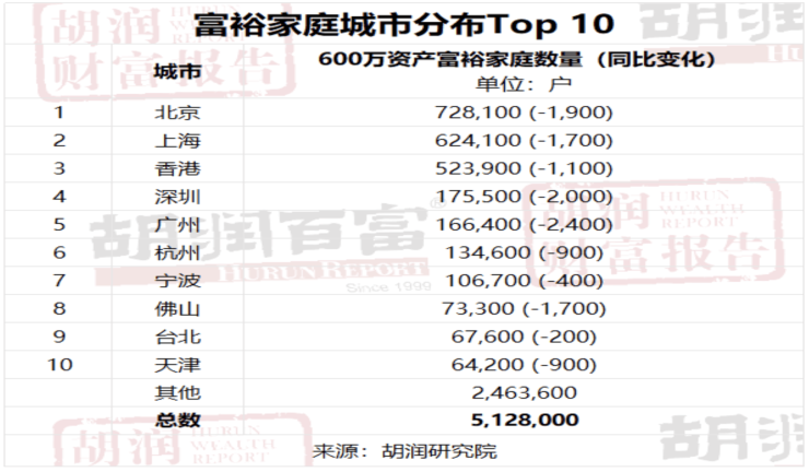 北京继续保持着最多600万资产富裕家庭的地区,数量为72.8万户,较上年减少了1,900户,降幅为0.26%,其中拥有600万可投资资产的家庭有27.5万户。广东位居第二,富裕家庭数量为70.3万户,比上年减少了2,100户,跌幅为0.3%,拥有600万可投资资产的家庭有25.8万户。上海位列第三,富裕家庭数量为62.4万户,比上年减少了1,700户,跌幅为0.27%,拥有600万可投资资产的家庭有22.2万户。浙江排名第四,富裕家庭数量为54.9万户,比上年减少了1,200户,跌幅为0.22%,拥有600万可投资资产的家庭有19.6万户。香港位列第五,富裕家庭数量为52.4万户,比上年减少了1,100户,拥有600万可投资资产的家庭有18.1万户。