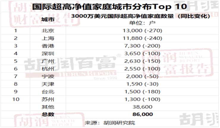 北京依然是拥有最多3000万美元资产的国际超高净值家庭的地区,尽管数量比上年减少了270户,降至13,000户,跌幅为2%,其中拥有3000万美元可投资资产的家庭有8,960户。上海以11,880户位居第二,比上年减少了240户,跌幅为1.9%,拥有3000万美元可投资资产的家庭有7,260户。广东位列第三,国际超高净值家庭数量为11,280户,比上年减少了240户,跌幅为2.1%,拥有3000万美元可投资资产的家庭有6,800户。浙江排名第四,国际超高净值家庭数量为9,940户,比上年减少了210户,跌幅为2.1%,拥有3000万美元可投资资产的家庭有6,240户。香港以7,300户位列第五,比上年减少了200户,跌幅为2.7%,拥有3000万美元可投资资产的家庭有4,380户。