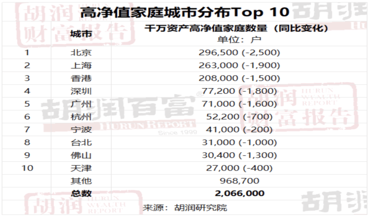 广东继续领跑千万资产高净值家庭数量,尽管较去年减少了2,400户,总数仍达到29.8万户,其中拥有千万可投资资产的家庭为16.8万户。北京以29.6万户位居第二,同比减少2,500户,拥有千万可投资资产的家庭为15.1万户。上海位列第三,高净值家庭数量为26.3万户,同比减少1,900户,拥有千万可投资资产的家庭为14.6万户。浙江以21.3万户排名第四,同比减少1,800户,拥有千万可投资资产的家庭为10.7万户。香港则以20.8万户位列第五,同比减少1,500户,拥有千万可投资资产的家庭为10.6万户。