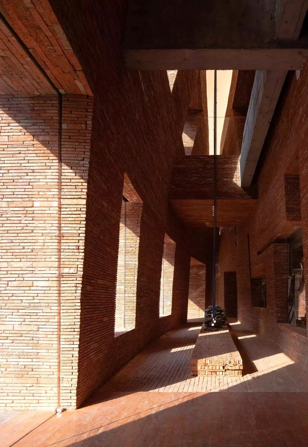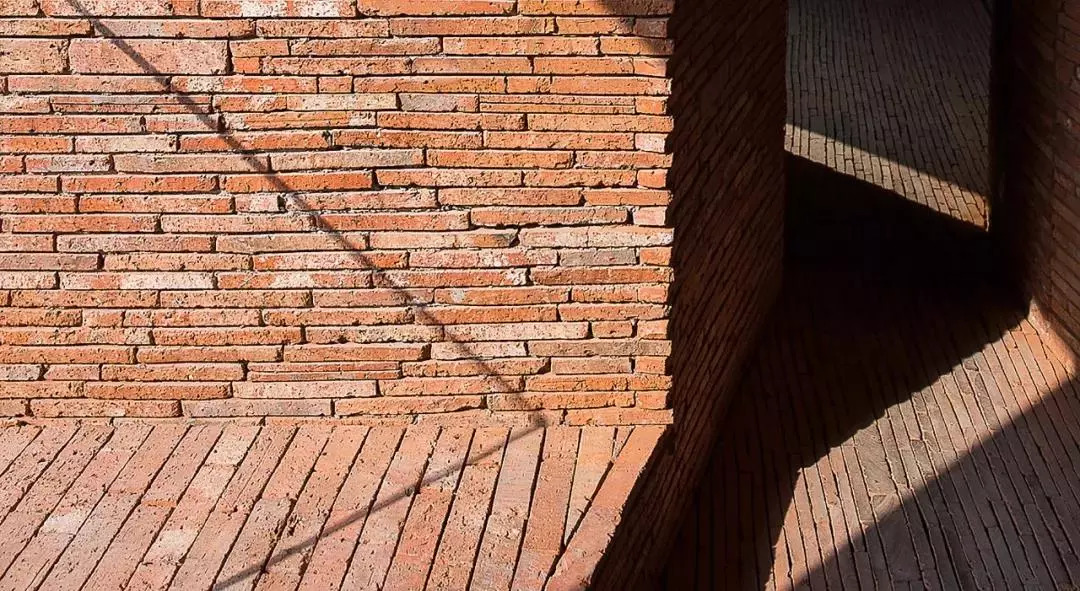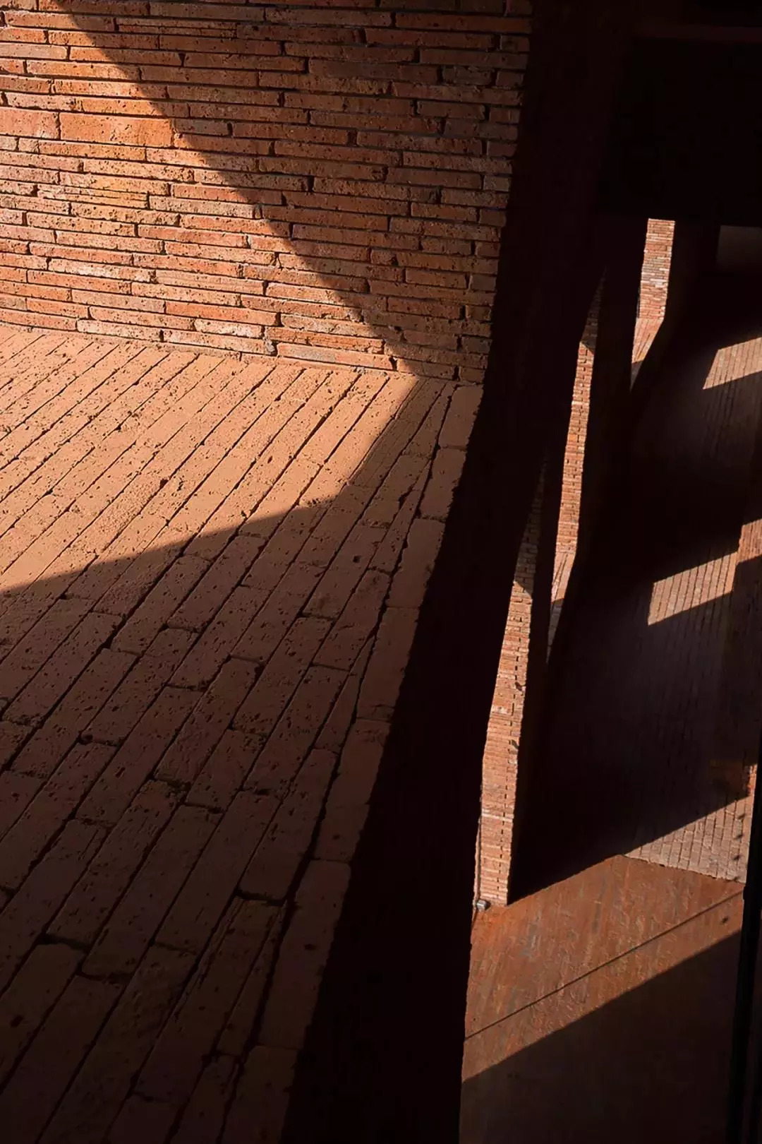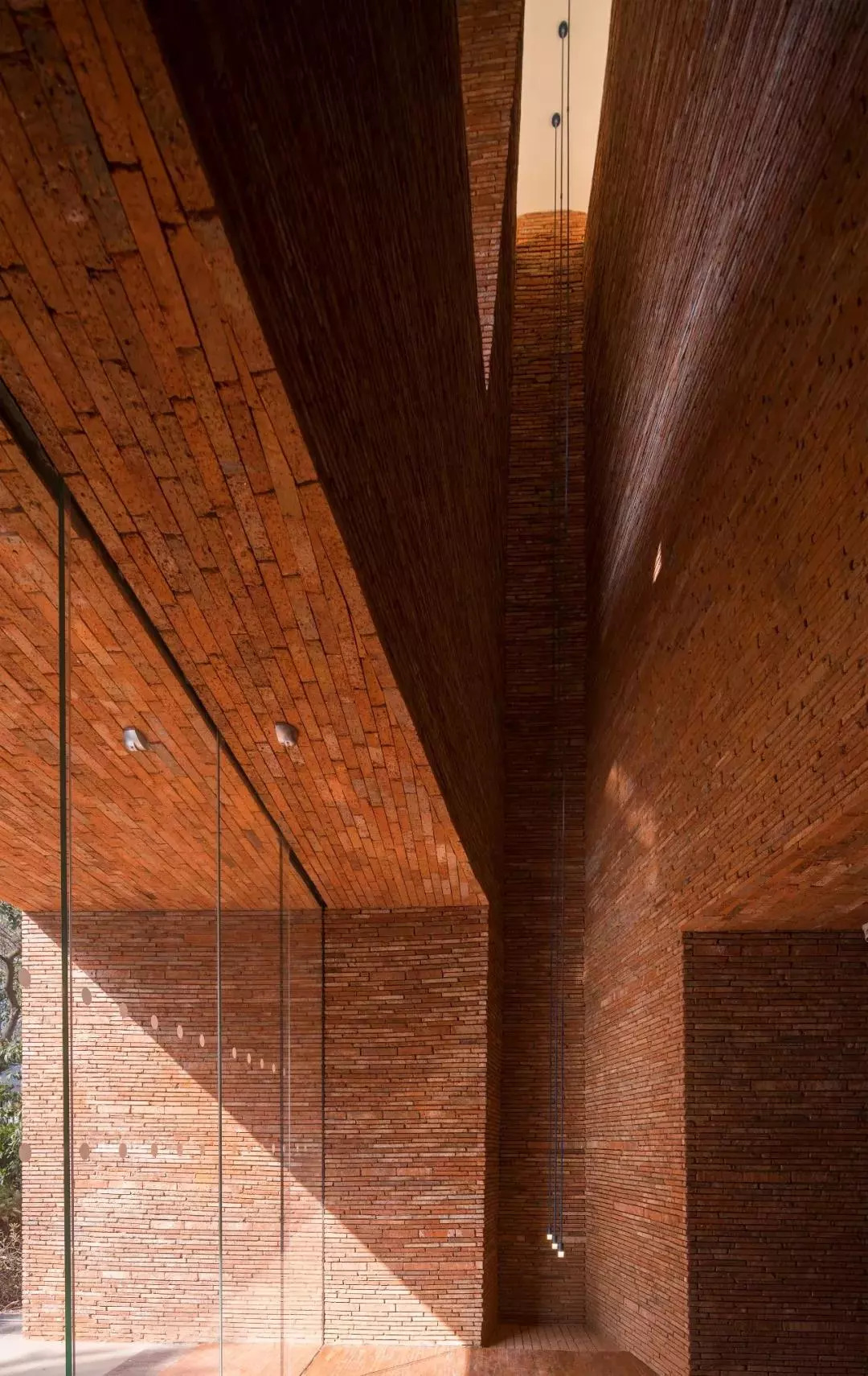 两侧鱼腹型墙翼使得光线在此进行复杂反射,通过矩形窗洞进入峡谷的光线被弧形墙体柔化,并通过旧红砖的粗糙表皮形成投影与机理间的观感对冲。