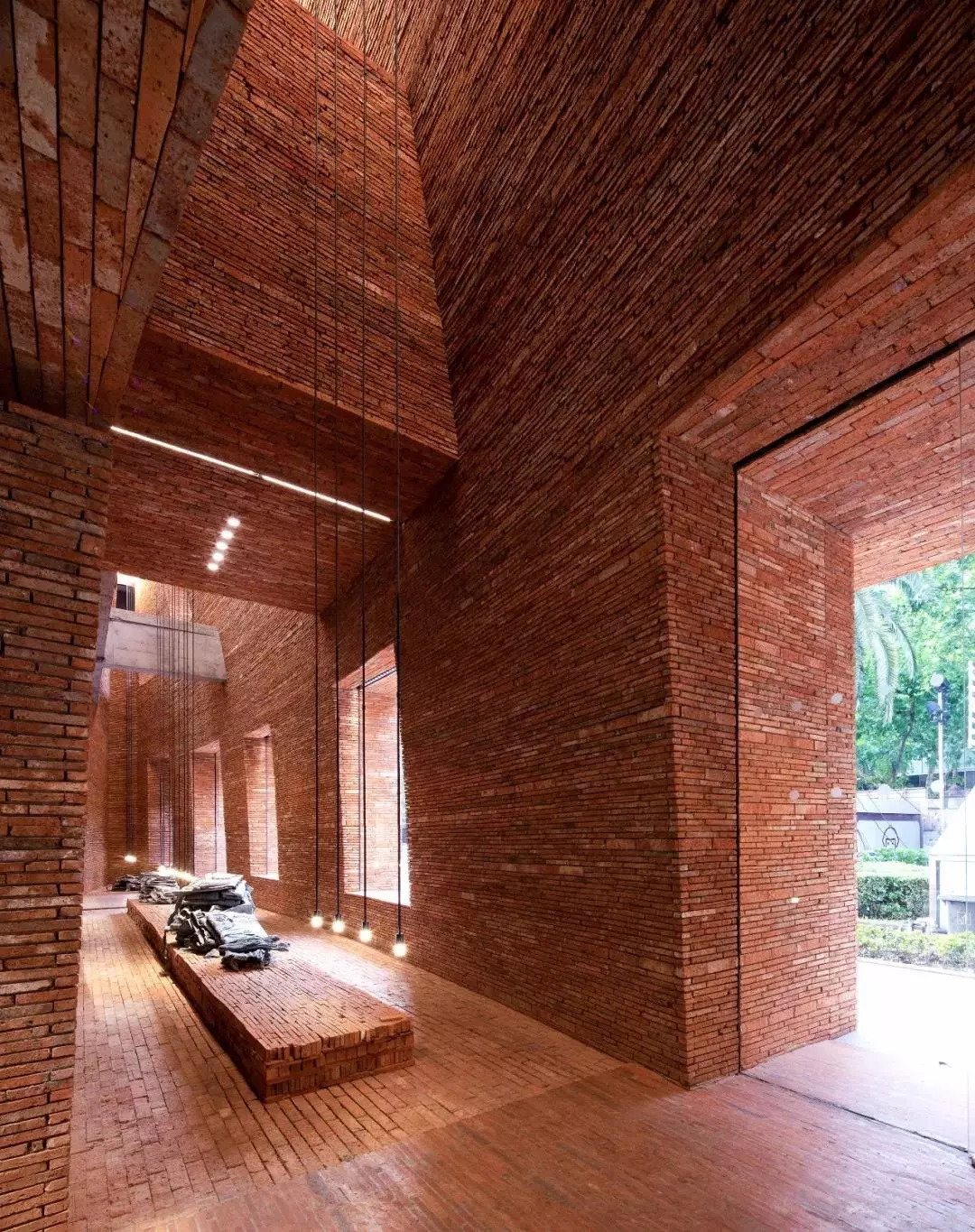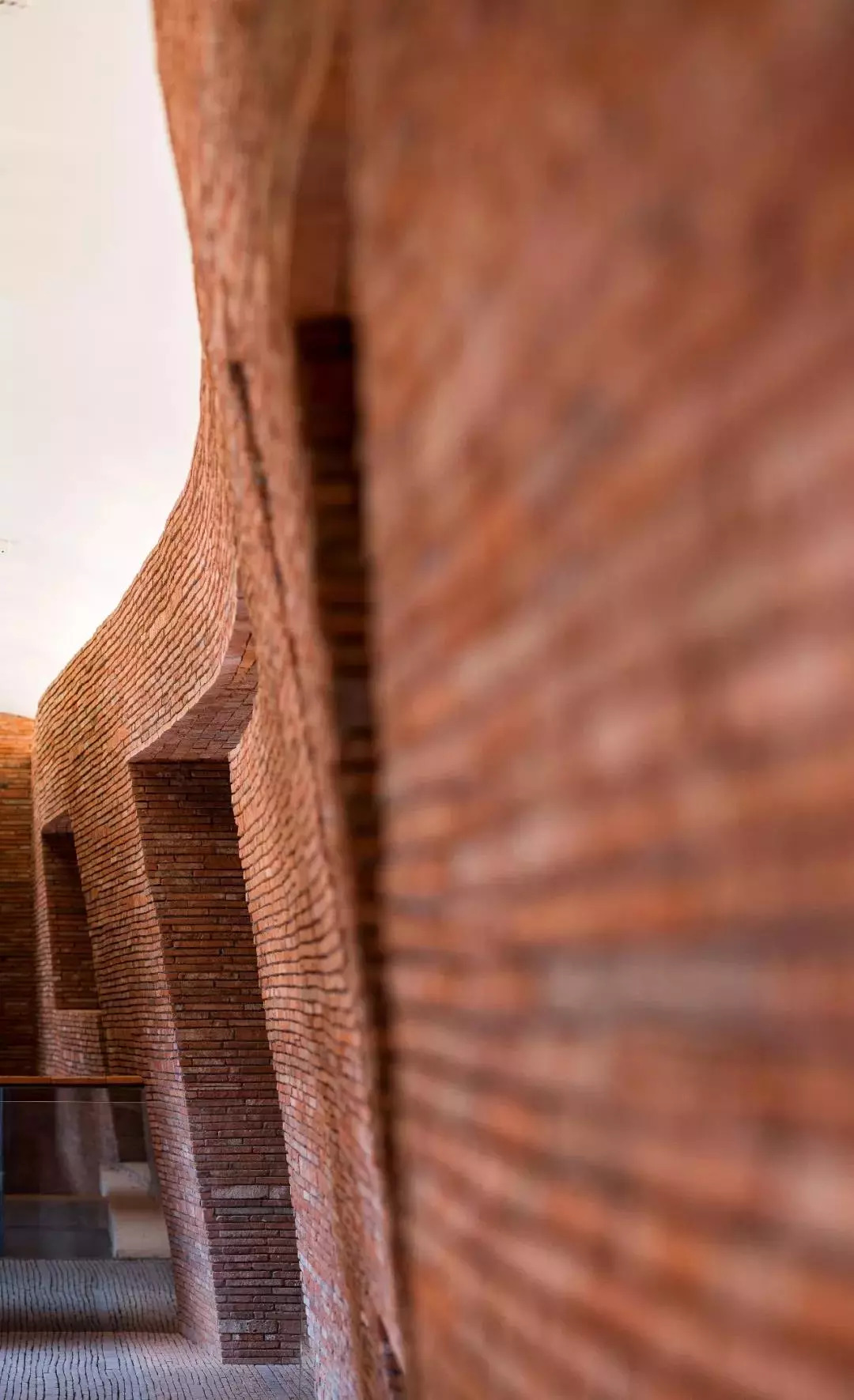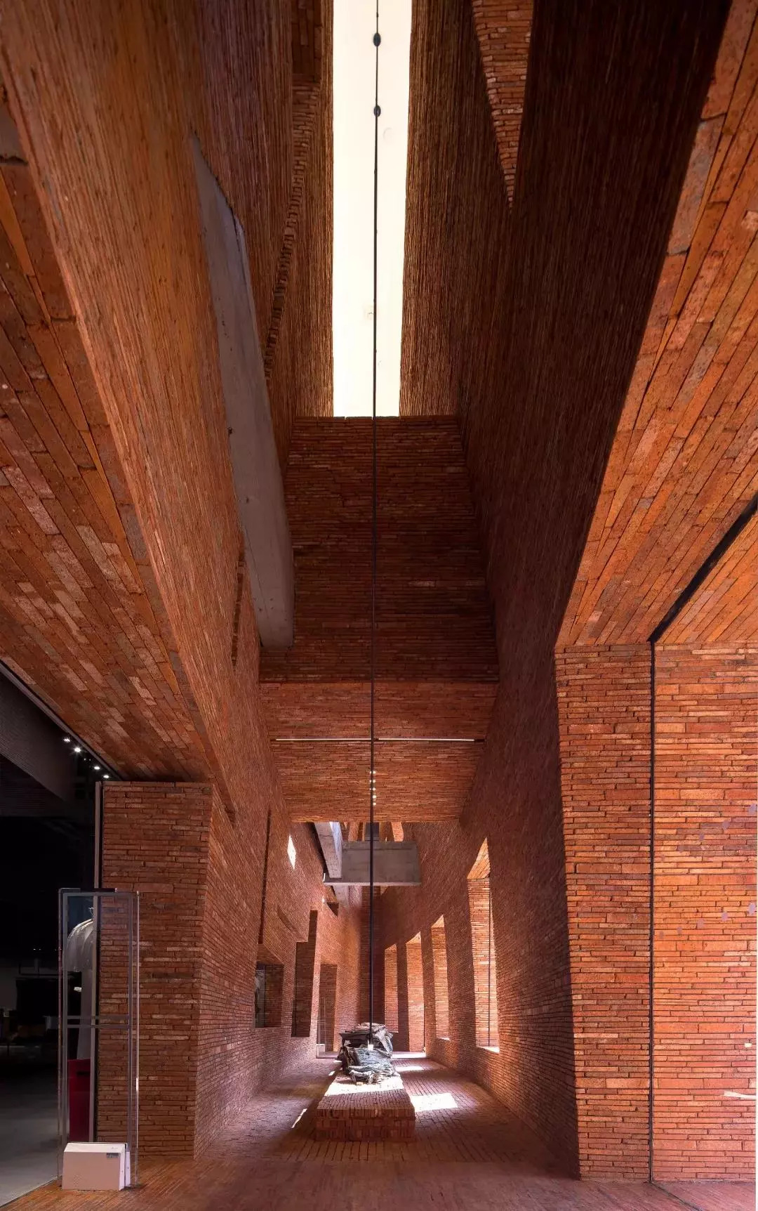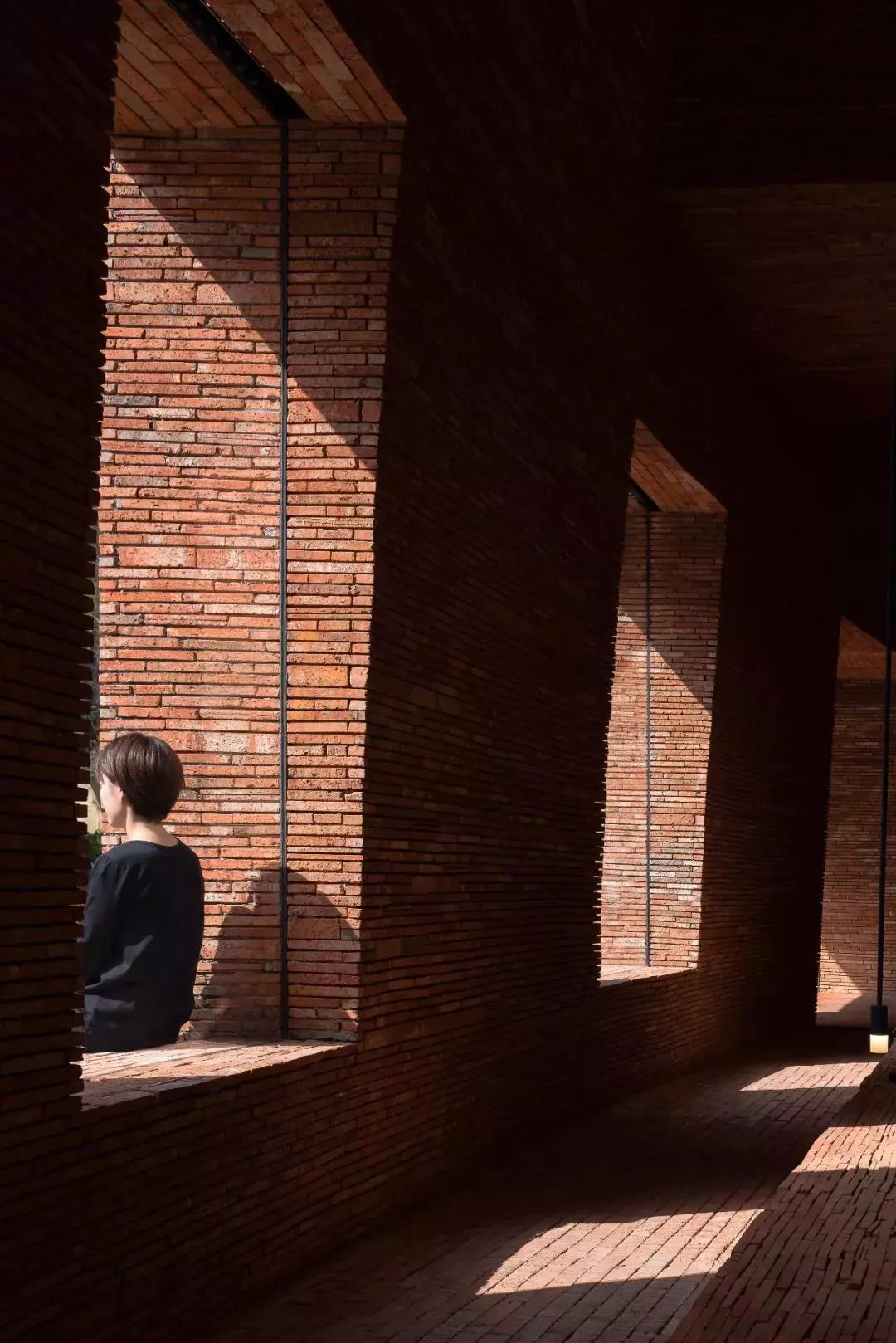 两侧鱼腹型墙翼使得光线在此进行复杂反射,通过矩形窗洞进入峡谷的光线被弧形墙体柔化,并通过旧红砖的粗糙表皮形成投影与机理间的观感对冲。