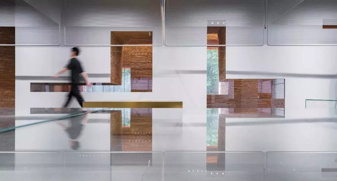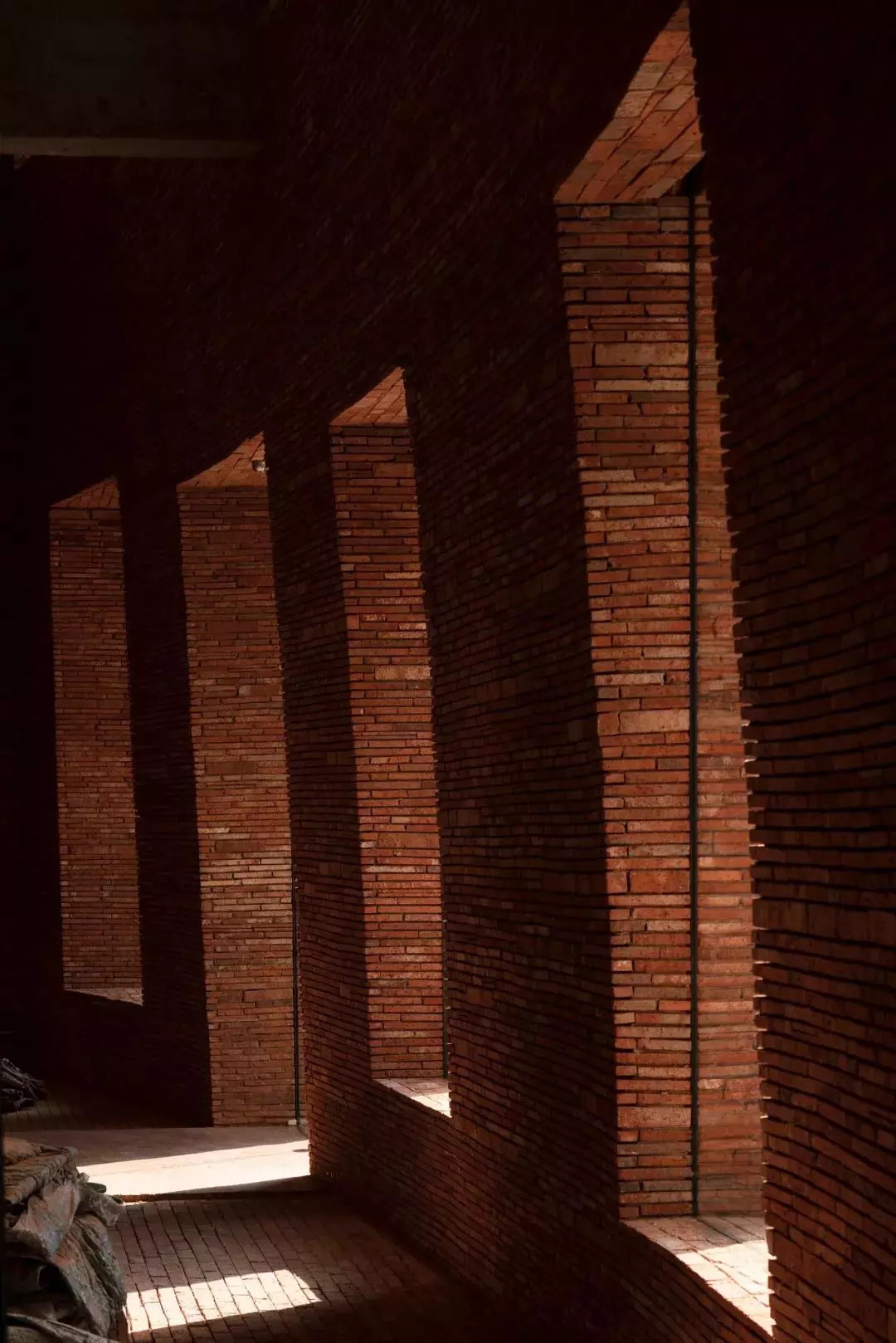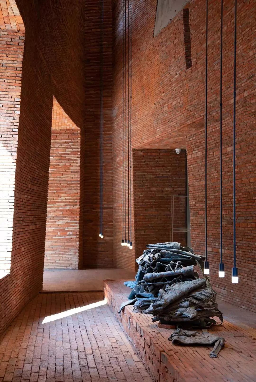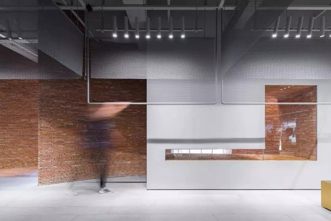 两侧鱼腹型墙翼使得光线在此进行复杂反射,通过矩形窗洞进入峡谷的光线被弧形墙体柔化,并通过旧红砖的粗糙表皮形成投影与机理间的观感对冲。